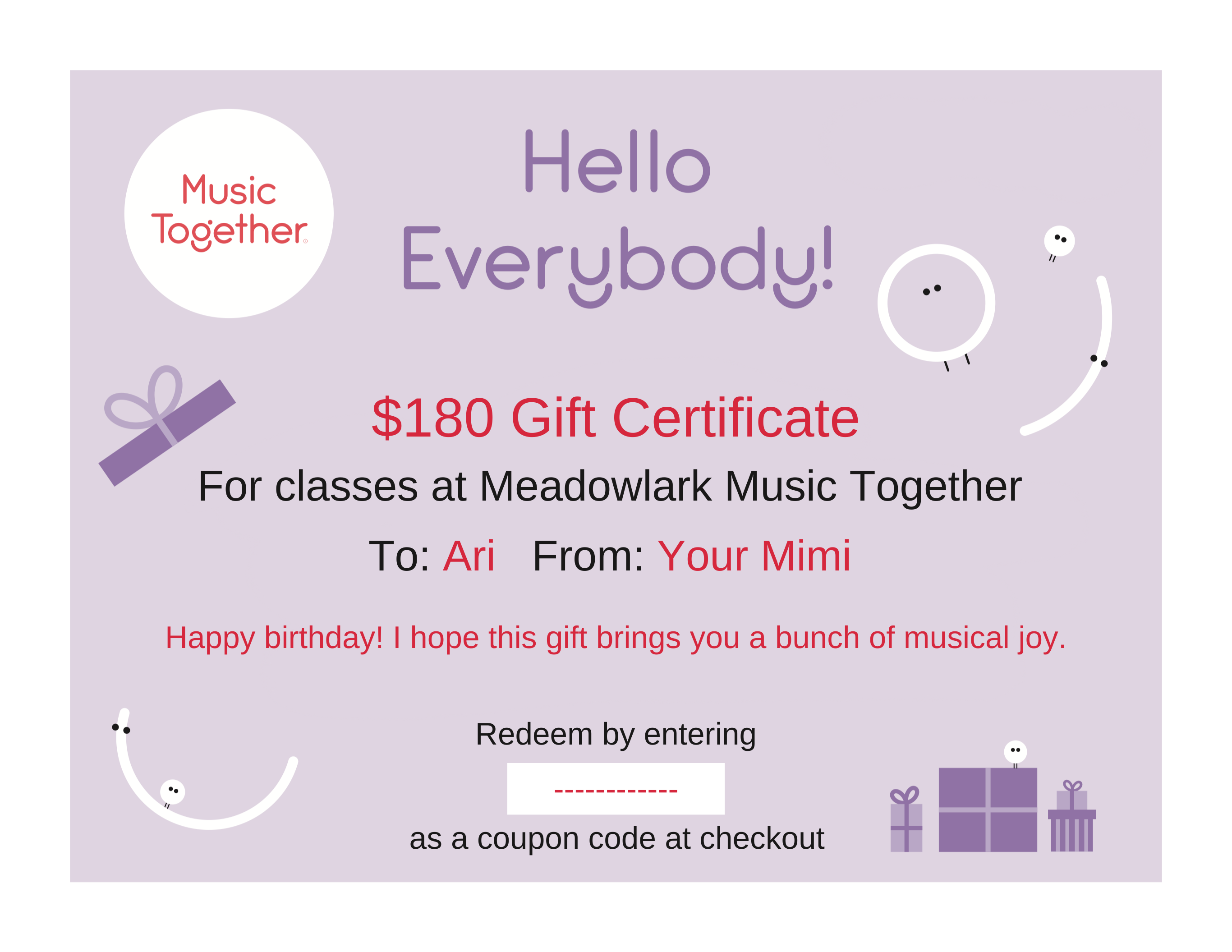 The certificate has the dollar value of the code written on it, as well as "to" and "from" fields and a blank area in which a message can be written. We can fill out the "to" and "from" fields for you, write a special message on the certificate, and/or send it with a special subject line. We recommend filling out some of these options if you're getting it emailed directly to the final recipient, or want to be able to copy over the image file without needing to make any edits! Or, if you leave these options blank, we will use the subject line "Meadowlark Music Together Gift Certificate" and leave the sections of the certificate blank for you to write in yourself, either by using the image editing software of your choice or by printing it out to write on by hand.